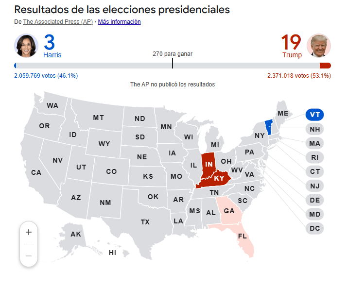 Pasadas las 11:00 PM (hora UTC) empezaron a conocerse los primeros datos de recuentos de votos oficiales. En ellos, se observa que Donald Trump tiene ventaja sobre su contendiente, Kamala Harris.