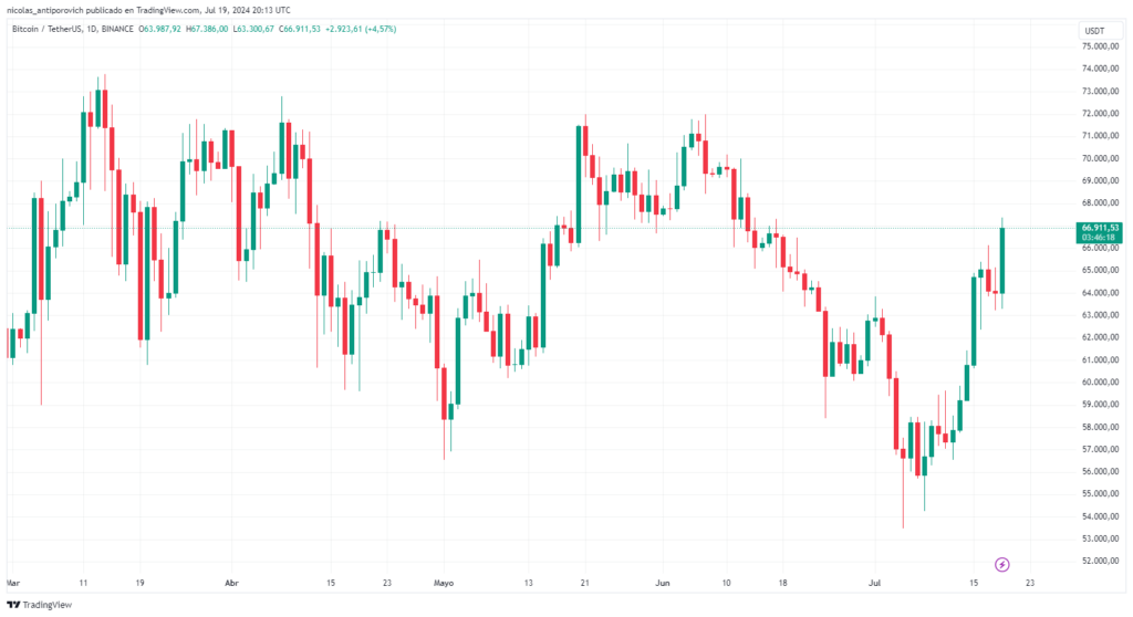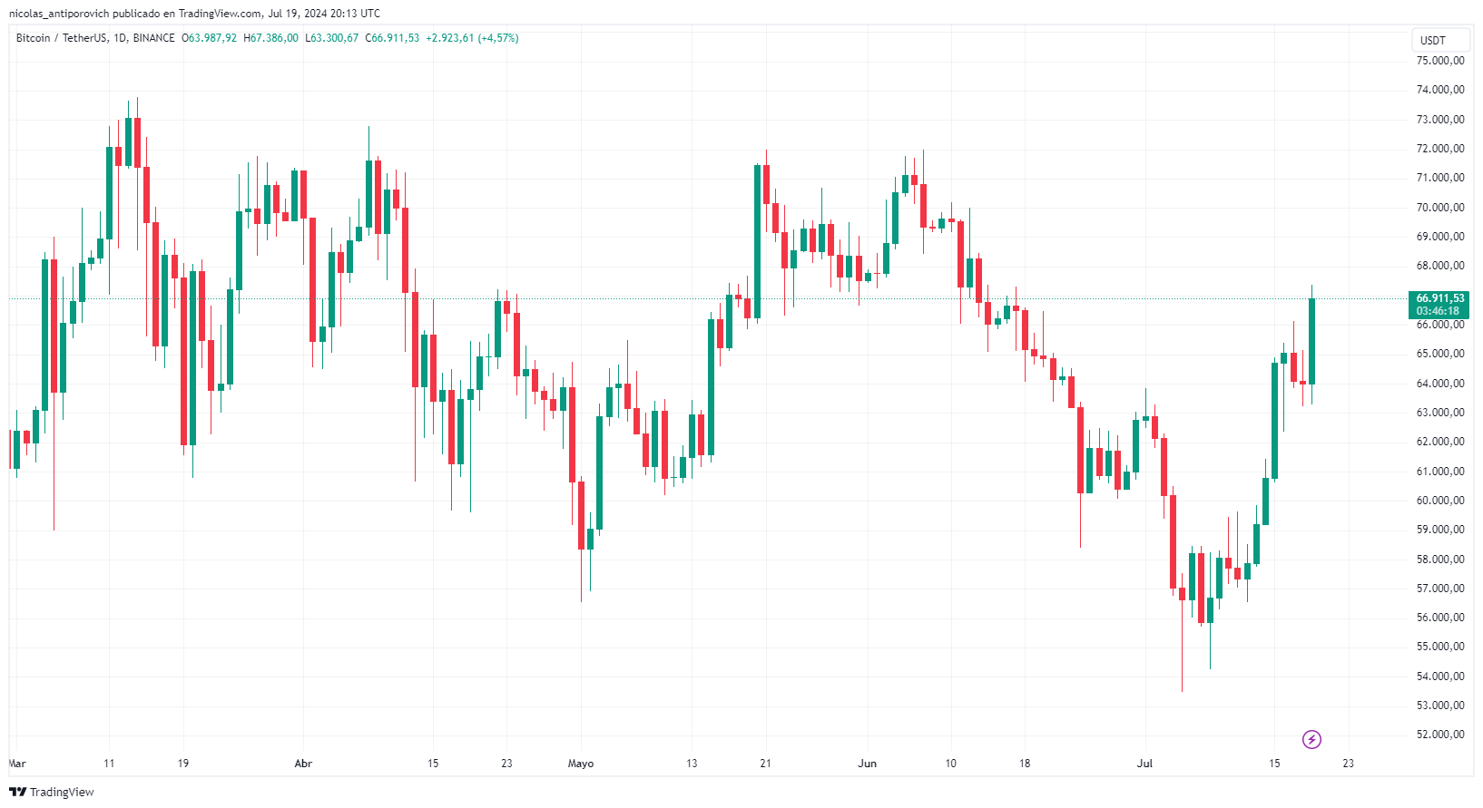 Al momento de esta publicación, cada BTC se comercia por 66.900 dólares y, minutos atrás, superó la marca de 67.000 dólares.