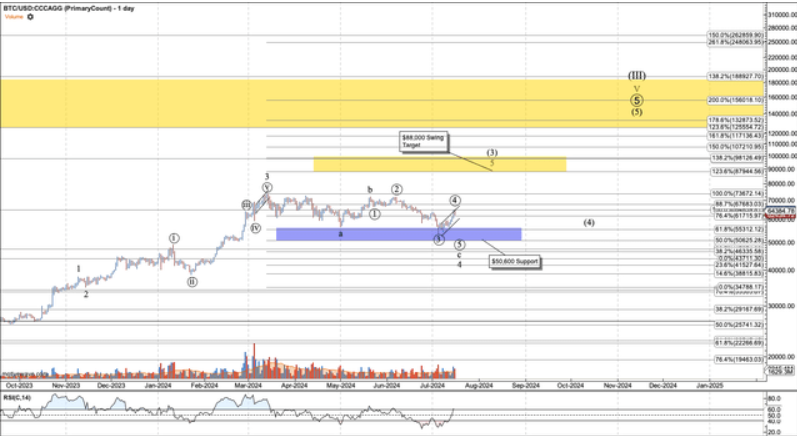En este caso, el nivel de 50.600 representa el retroceso del 50% de la onda 3 alcista que alcanzó su máximo en marzo de 2024, alrededor de 73.000 dólares como se mencionó antes en este artículo.