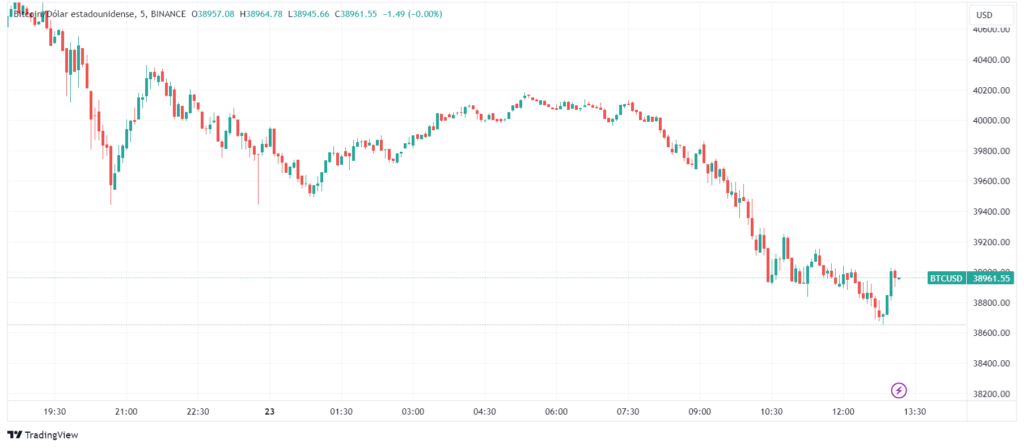 Como lo informó CriptoNoticias, la cotización de BTC cayó ayer del soporte de USD 40.000, llevando a la moneda a marcar un nuevo mínimo para el 2024, que actualmente ronda en la zona de los USD 38.000, tal como se observa en el siguiente gráfico de TradingView. Esto llevó a una caída general del mercado de criptomonedas.