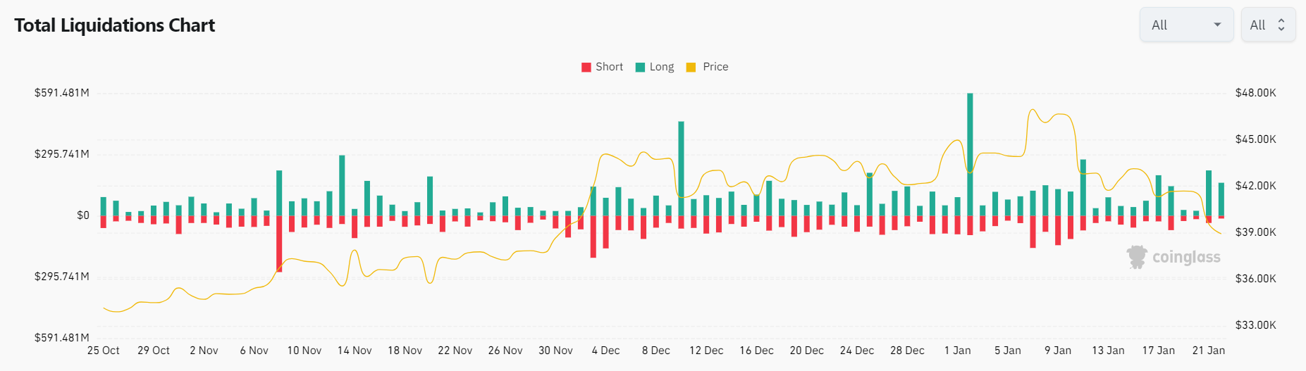 Como se ve en verde en el siguiente gráfico, en los últimos dos días, las liquidaciones han sido principalmente de posiciones alcistas y, junto con las bajistas, ya son más de USD 400 millones.