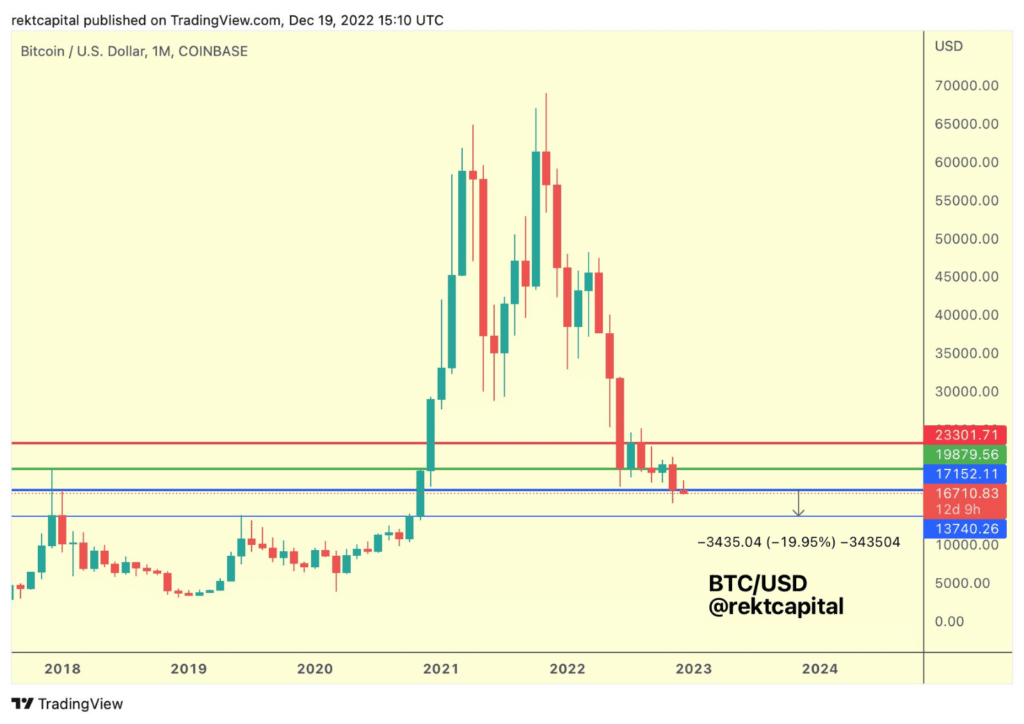 “Como resultado, una caída al Rango Mínimo de ~USD 13.900 podría estar en las cartas. La revisión de [ese nivel] marcaría una caída del 20% con respecto a los precios actuales”, alertó Rekt Capital este lunes 19 de diciembre.