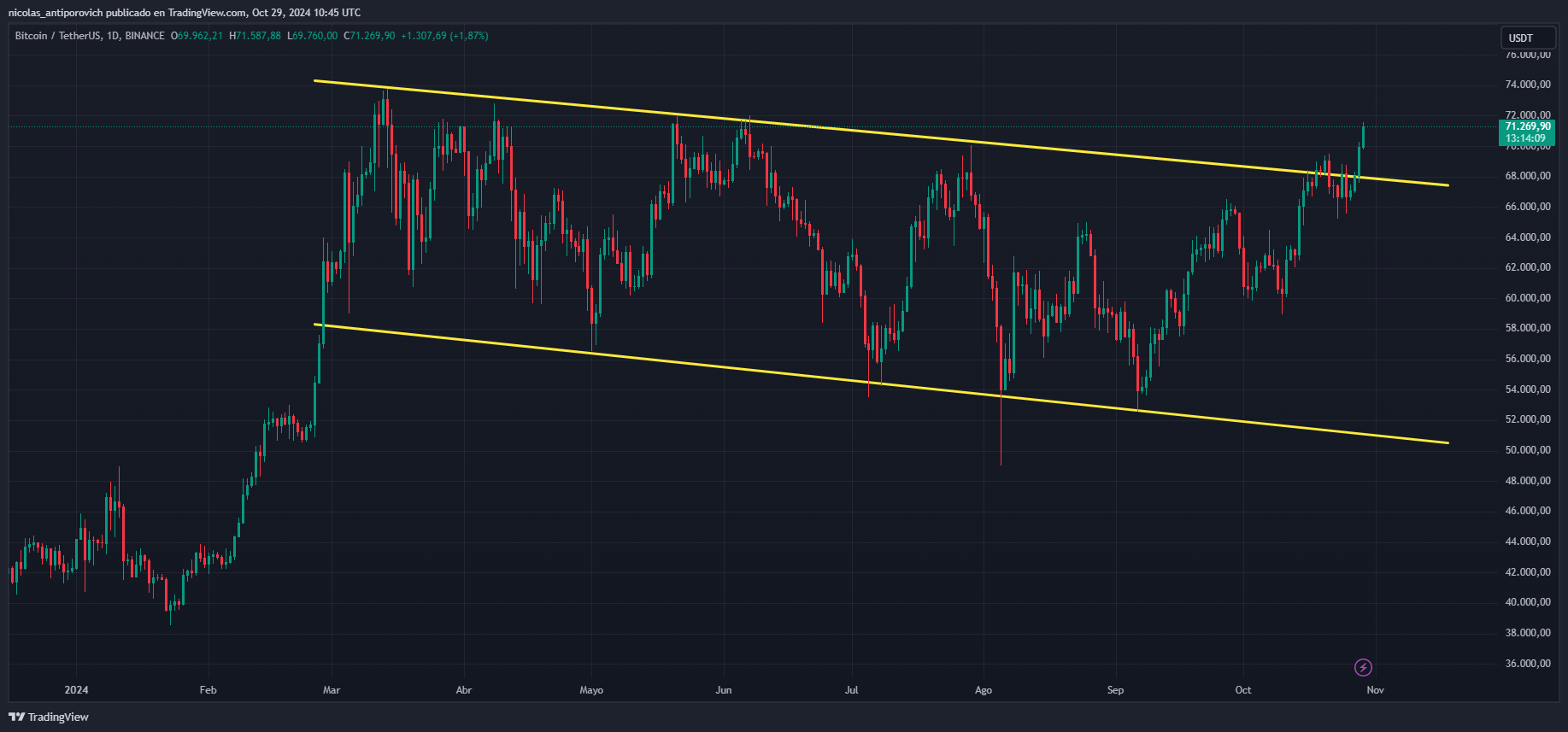 Como puede verse en el siguiente gráfico, provisto por TradingView, tras marcar su máximo histórico cercano a los 74.000 dólares, BTC había entrado en una tendencia bajista de la que no había logrado salir… hasta ahora.