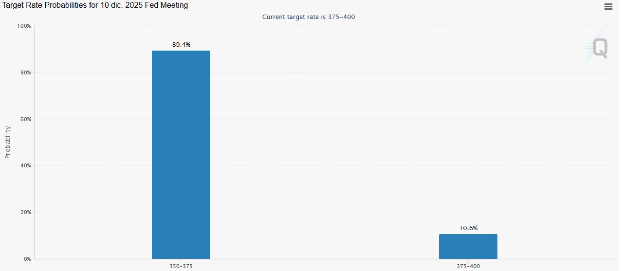 Según el mercado de derivados CME Group, el recorte de tasas de interés en EE. UU. está más que garantizado. Ellos asignan un 89,4% de probabilidades a una rebaja de 25 puntos básicos, que dejarían los tipos en el orden del 3,50% anual.