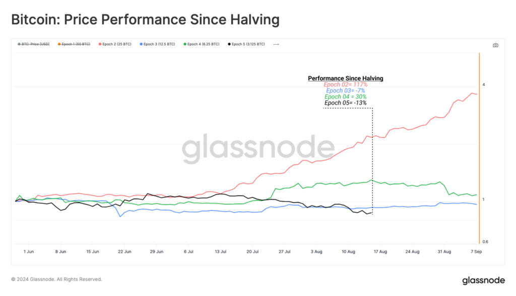 A su vez, el movimiento de precio ante el último halving también denota diferencias en relación a los tres anteriores que hubo en la historia. De hecho, el desempeño desde tal evento, ocurrido hace tres meses, es el peor por ahora con una caída del 13%. Aunque se distingue por ser la primera vez que alcanzó un nuevo máximo histórico en la previa.