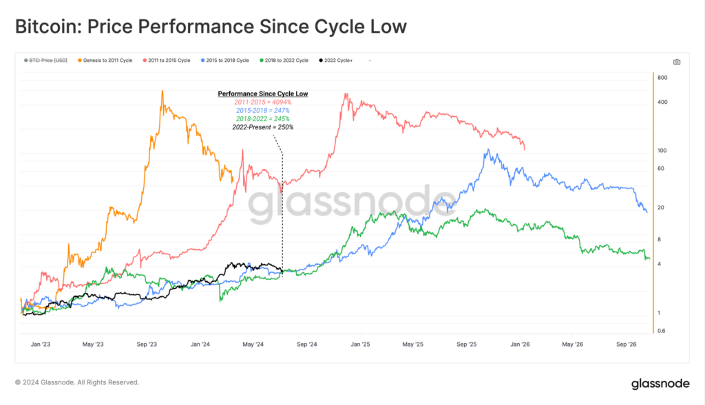 “Si evaluamos el comportamiento de los precios en relación con cada mínimo del ciclo, el mercado de 2023-2024 se ha comportado de forma sorprendentemente similar a los dos últimos ciclos”, expresó al respecto la firma de análisis Glassnode. Se trata de los ciclos ocurridos de 2015 a 2017 y de 2018 a 2021.