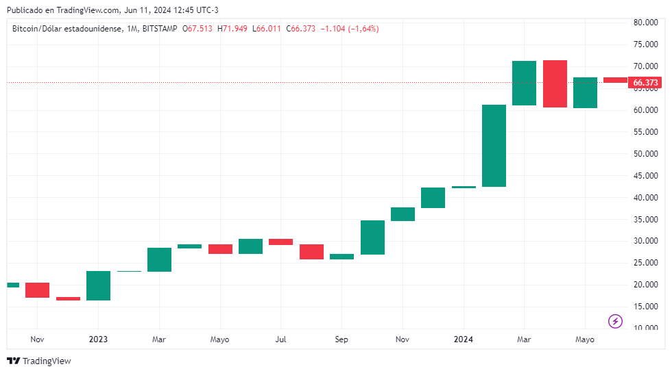 BTC alcanzó su máximo histórico el pasado 14 de marzo, cuando su precio llegó a 73.700 dólares.