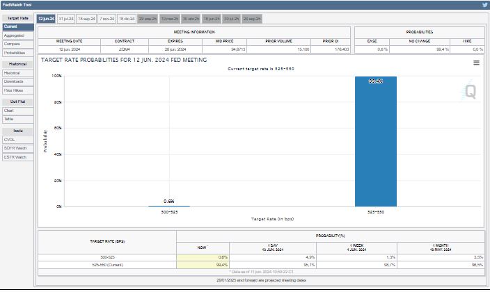 De acuerdo con la herramienta CME FedWatch, las probabilidades de que la FED anuncie una baja en las tasas de interés son sólo del 0,6%. En ese marco, los operadores proyectan que hay un 50% de probabilidades para que se produzca un recorte a partir de septiembre.