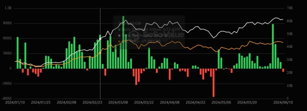 En la previa de estos anuncios, BTC arrancó el martes con una cotización alrededor de los 67.000 dólares, lo que representa una baja del 3,5% con respecto al día anterior. En tanto, los fondos cotizados en bolsa (ETF) rompieron este 10 de junio una racha de 19 jornadas con saldo positivo y registraron salidas netas de 65 millones de dólares. Así lo refleja el siguiente gráfico: