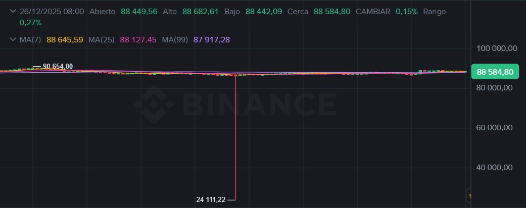 Bitcoin (BTC) protagonizó un episodio de volatilidad extrema en el exchange Binance durante la noche de Navidad, cuando su cotización en el par comercial BTC/USD1 se desplomó hasta los 24.000 dólares, antes de volver a superar los 88.000 dólares en la jornada actual.