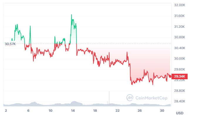 La única vez que bitcoin terminó un mes en pérdidas en 2023 fue en mayo, cuando su cotización cerró casi 7% del precio inicial. Ahora, BTC se encuentra 3,5% por debajo del precio que tenía el 1 de julio, en torno a los USD 30.570.