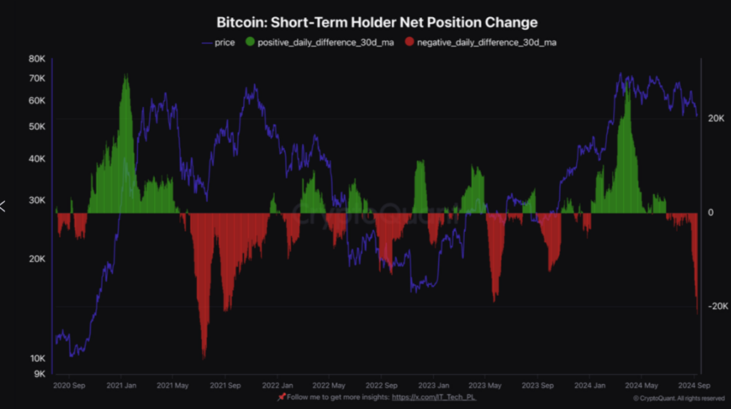 En la siguiente métrica on-chain, las áreas rojas representan el flujo de estos inversionistas que, al sentirse desanimados por la volatilidad, redujeron su exposición a BTC entre agosto y lo que va de septiembre.