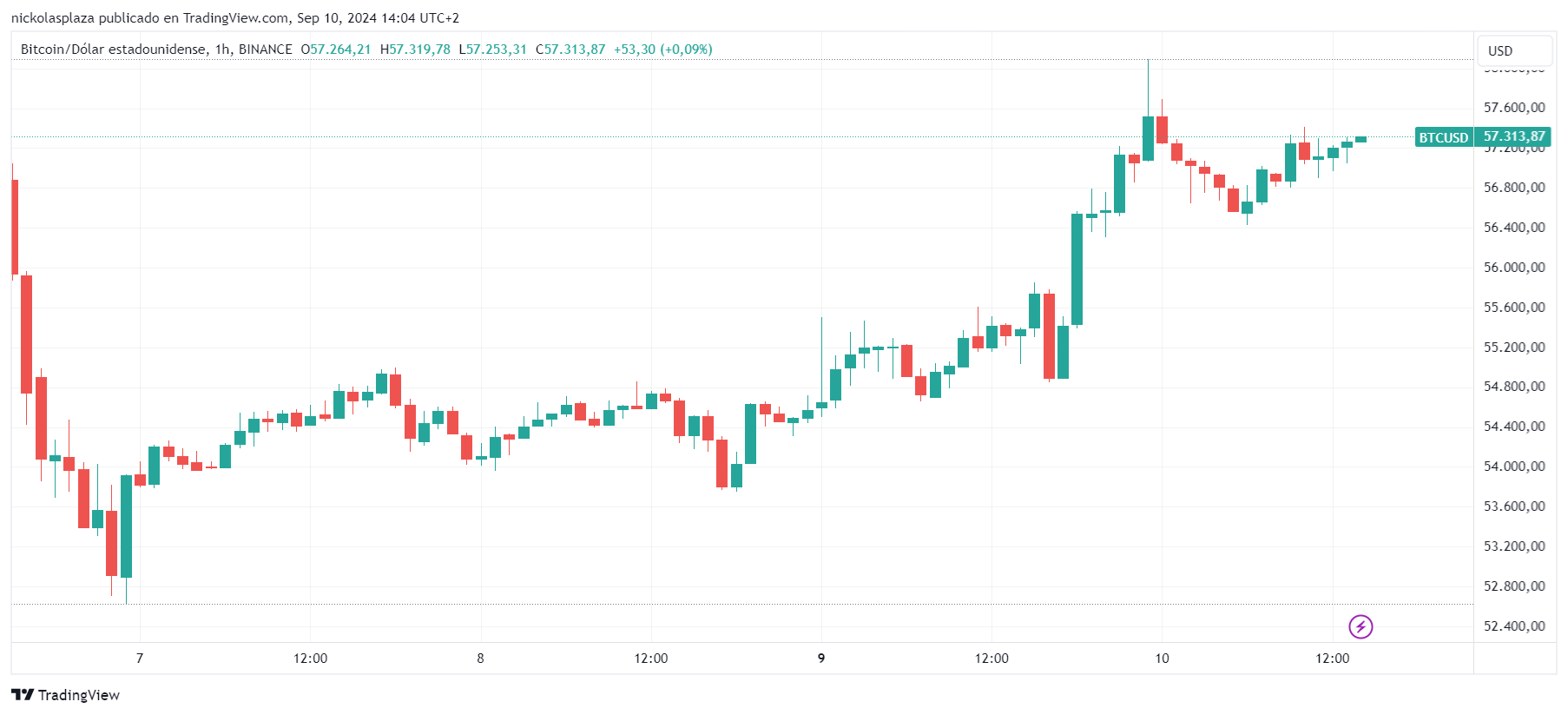 En cuanto al precio de bitcoin, se ha recuperado después de caer por debajo de los 52.000 dólares. Actualmente, el activo digital se cotiza en 57.300 dólares, como se puede apreciar en el siguiente gráfico de TradingView.