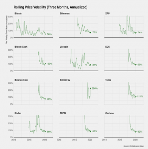 Criptoactivos como ether (ETH), XRP de Ripple, e incluso binance coin poseen un porcentaje de volatilidad histórica que se eleva hasta 70%, en el mismo lapso, de acuerdo a las estimaciones de Coin Metrics. En la gráfica siguiente se puede apreciar, por ejemplo, que los precios de bitcoin cash, tezos, y bitcoin SV superan el 100% de volatilidad realizada.