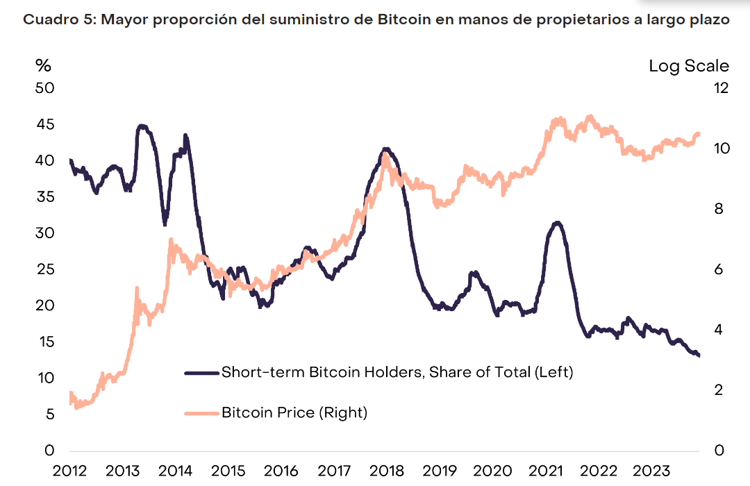 Los ETF tienen altas probabilidades de ser aprobados por la Comisión de Bolsa y Valores (SEC) de Estados Unidos en enero del próximo año, de acuerdo a estimaciones de varios analistas. La proporción del suministro de bitcoin “en manos de especuladores a corto plazo alcanzó un mínimo histórico”, representados en el siguiente gráfico con el color azul.