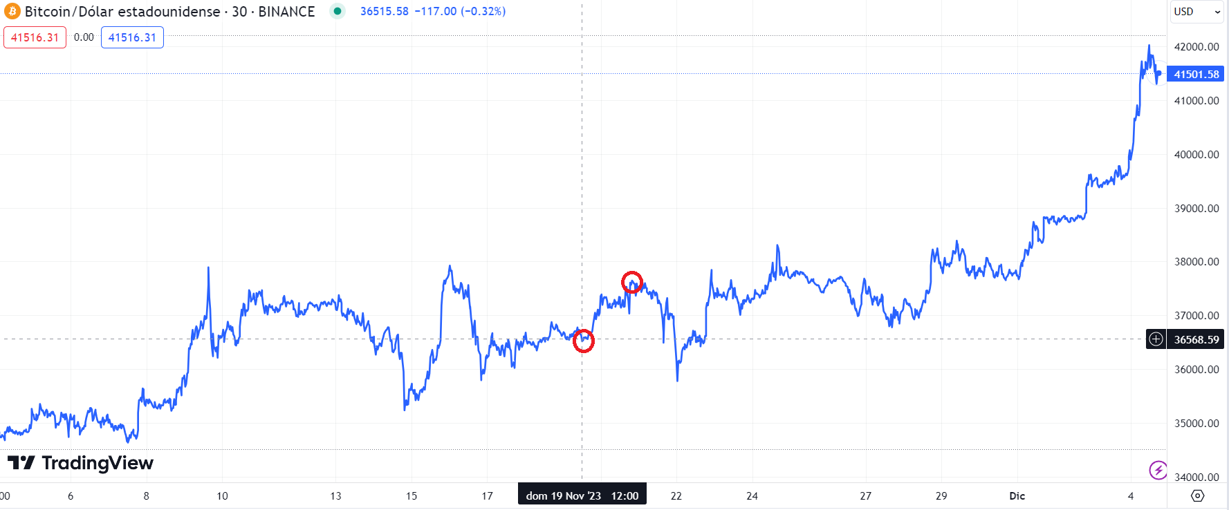 El economista argentino fue elegido el pasado 19 de noviembre y, tras darse a conocer los resultados, el precio de bitcoin tuvo un ligero aumento, pasando de USD 36.517 a USD 37.667, lo que representa una subida de 3%, como se puede ver el gráfico provisto por TradingView.