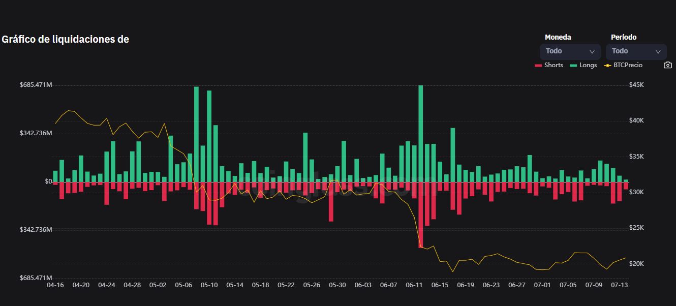 Las máximas liquidaciones ocurrieron el pasado mes de junio. Solo el 12 de junio pasado se liquidaron posiciones por USD 562 millones, de las cuales USD 218,3 millones o 38,9% correspondieron a posiciones en corto. Entre quienes apostaron al alza del precio, se liquidaron ese día USD 343,6 millones.