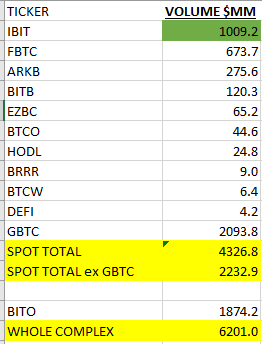 En la siguiente tabla compartida por el especialista en su cuenta de X, se observa el volumen de comercio en cada uno de estos productos financieros. Nótese que también añade, al final, a BITO (el ETF de futuros de bitcoin de la empresa ProShares). Si se suman todos, incluso el que no es al contado, se llega a 6.201 millones de dólares comerciados en tan solo un día: