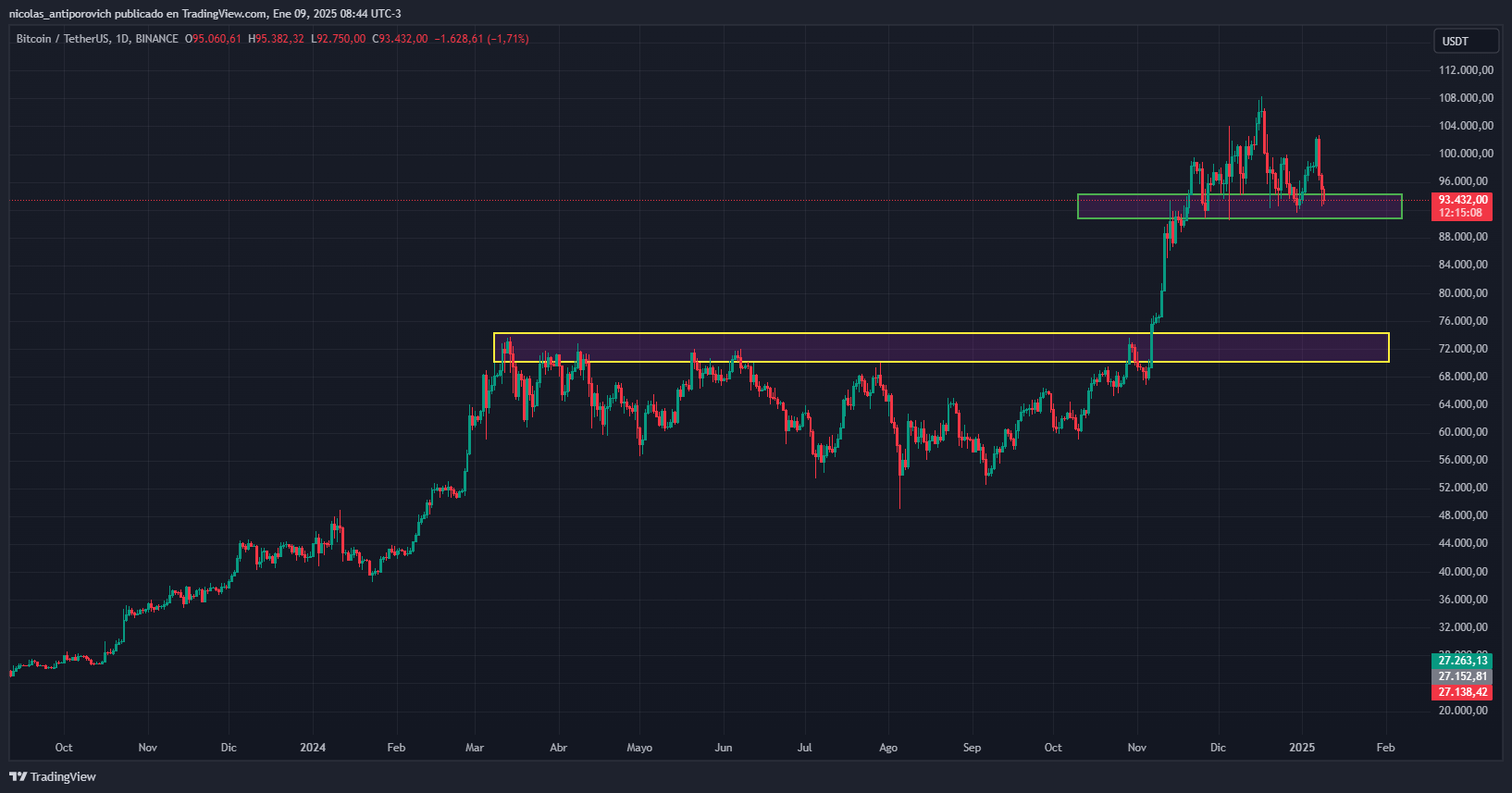 ¿Qué pasaría si bitcoin cae de los 90.000 dólares? Lo que se observa no es nada bueno. Bitcoin se encontraría con un área de soporte históricamente constituida recién en los 74.000 dólares, aproximadamente (rectángulo amarillo en el gráfico anterior.