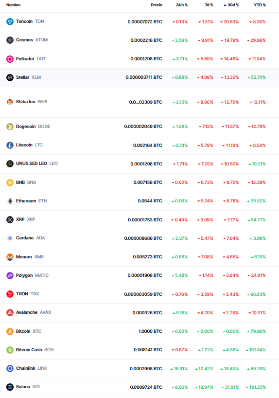 En los últimos 30 días, 8 de las 20 altcoins más valiosas del mercado han caído más de 10% con respecto a bitcoin. Entre ellas, la más afectada ha sido Toncoin (TON). La criptomoneda inicialmente desarrollada por Telegram y ahora en manos de su comunidad ha caído más de 20% frente a BTC en ese plazo.