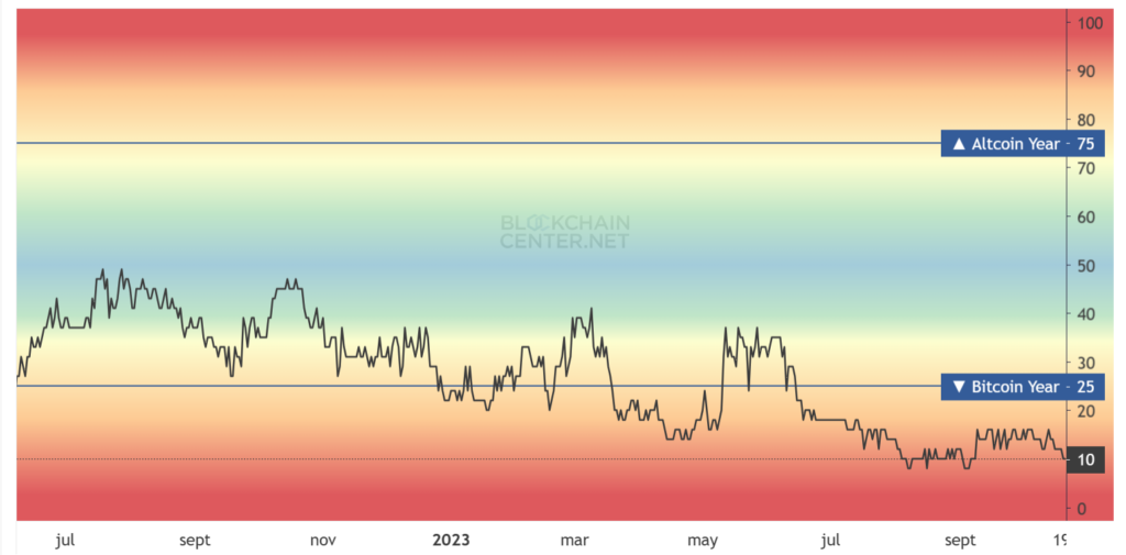 Tal ha sido el dominio de BTC sobre el mercado, que el índice de temporada de altcoins (o altseason index) también muestra esa tendencia con datos contundentes. Dicho índice compara los rendimientos de BTC con respecto a las 50 altcoins más valiosas del mercado en tres rangos de tiempo distintos para determinar si es tiempo de bitcoin o de las altcoins: 1 año, 90 días (rango considerado como una temporada) y 30 días.