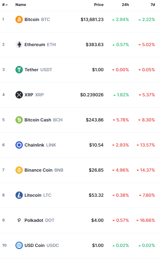 Entre este lunes y martes, la mayoría de las principales 30 criptomonedas según su capitalización de mercado muestran pérdidas. Bitcoin es la clara excepción, con un aumento de casi 3% en las últimas 24 horas. Al momento de redacción de esta nota, el precio de bitcoin se mantiene por encima de los 13.600 dólares.