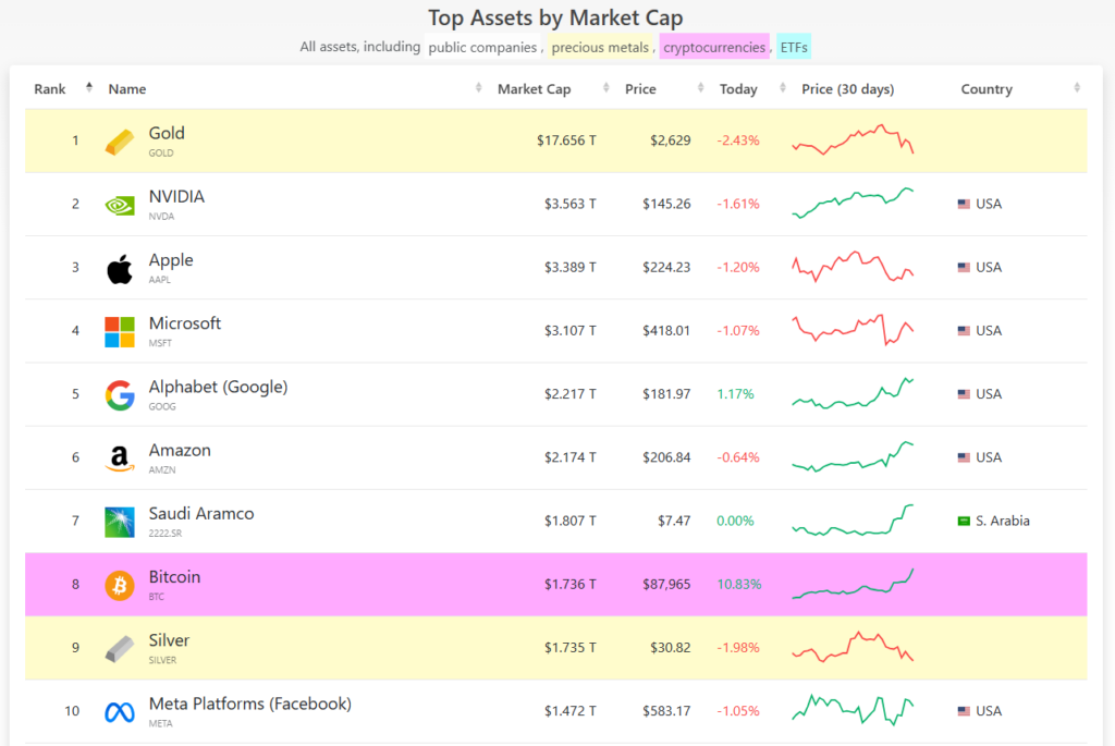 Al momento de esta publicación bitcoin es el octavo activo más valioso del mundo, tal como se observa en la siguiente imagen tomada del portal web CompaniesMarketCap.