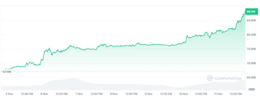 El precio de bitcoin (BTC) supera los 88.000 dólares, marcando así un nuevo máximo histórico. Además, con esta subida, la capitalización de mercado de BTC se eleva por sobre los 1,74 billones de dólares y supera así a la de la plata.