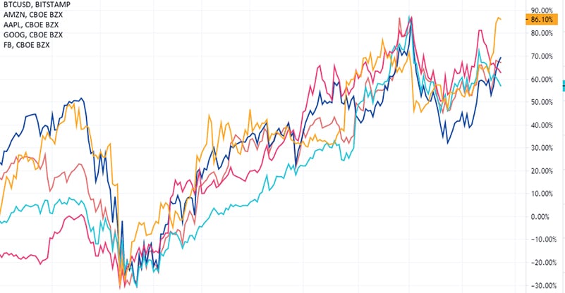 Solo Google se acerca al aumento de bitcoin, con 70% en lo que va de este año.