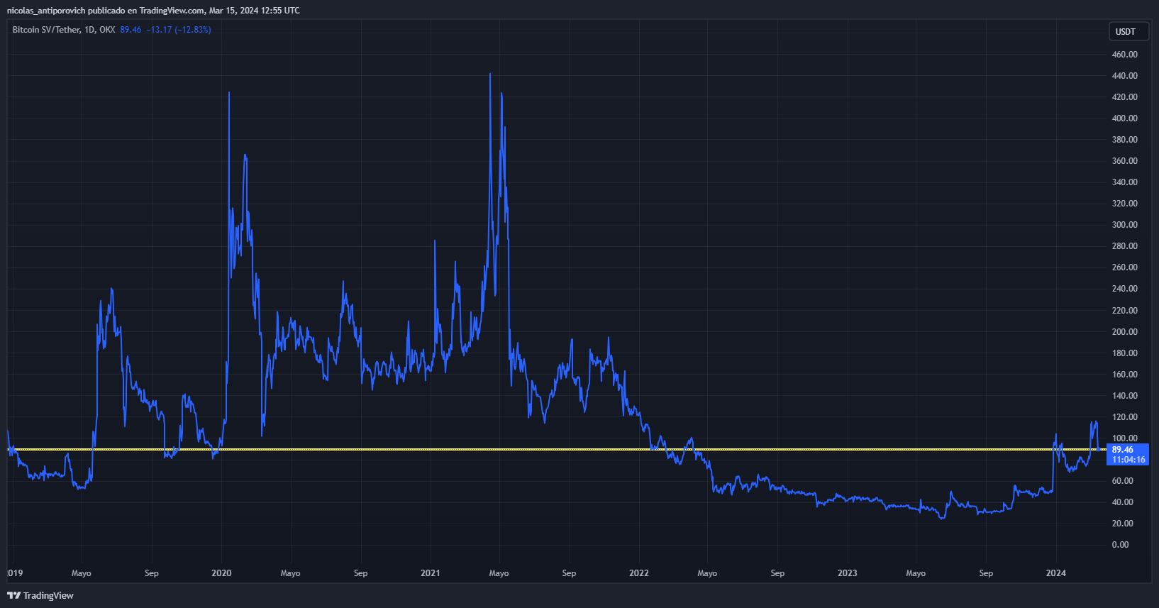 En el siguiente gráfico, provisto por TradingView, se puede ver el comportamiento histórico de BSV contra el dólar estadounidense: