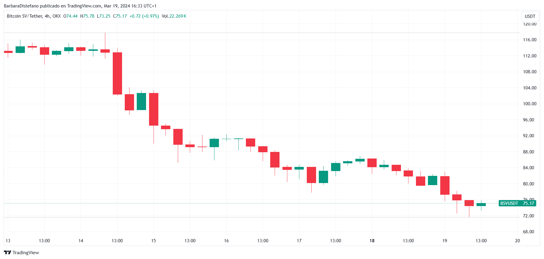 Bitcoin SV (BSV) se acerca a los 70 dólares, con una caída superior al 30% en lo que va del mes.