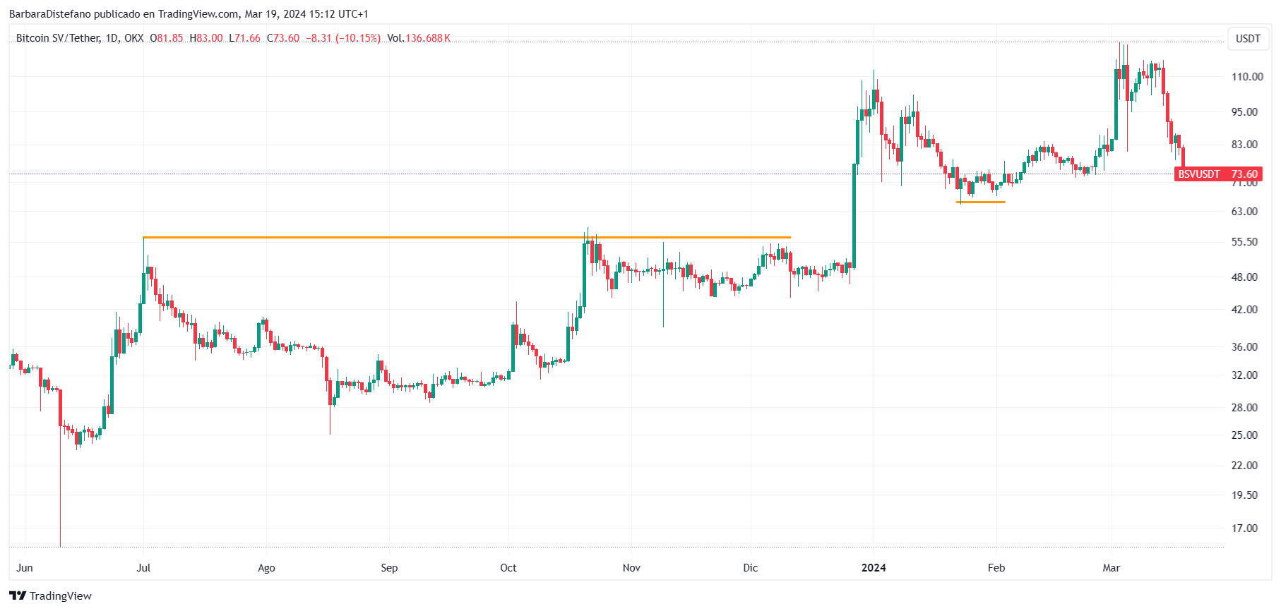 Precisamente, BSV mantuvo tal soporte desde fines del 2019 hasta principios de 2022 y no fue hasta el 2024 que lo recuperó por momentos. Con la pérdida nuevamente de este nivel hoy, su precio retrocedió hasta los USD 71, área que no tocaba en un mes y medio.