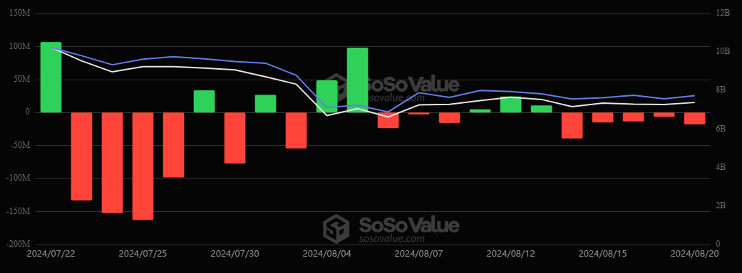 Por su parte, los fondos cotizados en bolsa basados en ether (ETH), la criptomoneda de la red Ethereum, acumulan cinco días de salidas de dinero. Se trata de la racha negativa más extensa desde su lanzamiento al mercado el 22 de julio de 2024.