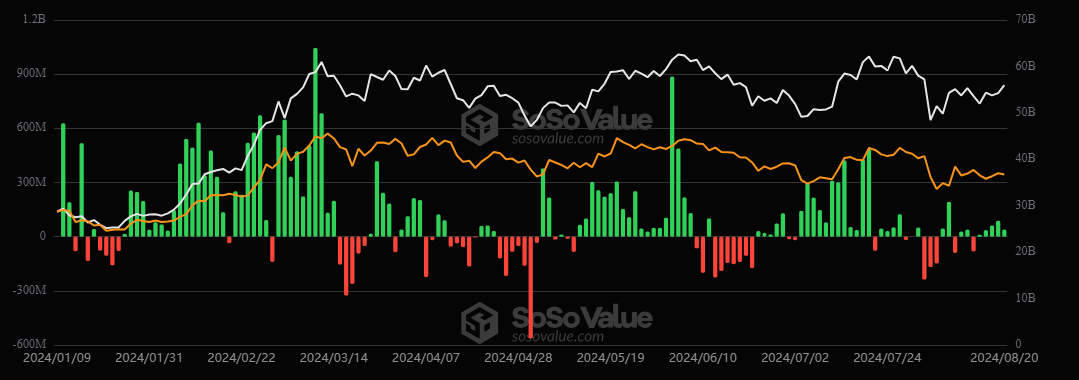 De acuerdo con datos de SosoValue, de los 11 ETF que hay en el mercado, el Grayscale Bitcoin Trust (GBTC) fue el que más ingresos de dinero tuvo este miércoles con más de 14 millones de dólares. Un escalón por debajo aparecen los instrumentos de Fidelity Wise Origin Bitcoin Fund (FBTC) y el Bitwise Bitcoin ETF (BITB) de Bitwise (BITB, que tuvieron flujos positivos por 10 millones de dólares.