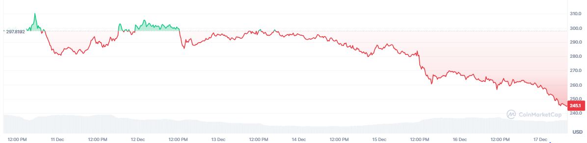 En los últimos 7 días, el token registra una caída del 17,4%. Al momento de la publicación de esta nota, TAO se negocia en 246 dólares, tal como se observa en el siguiente gráfico: