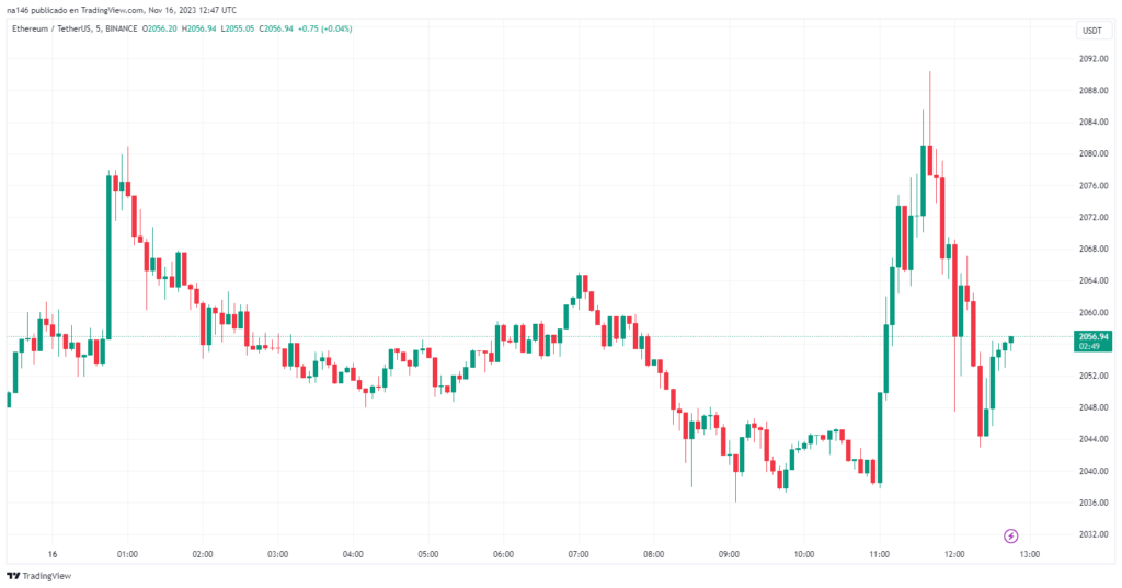 La nueva solicitud de ETF de ether al contado, impulsó el precio de ETH en las últimas horas, pasando de USD 2.039 a USD 2.087, lo que representa un aumento de 2,3%. Luego volvió a caer hasta su nivel inicial, tal como se observa en el siguiente gráfico de TradingView: