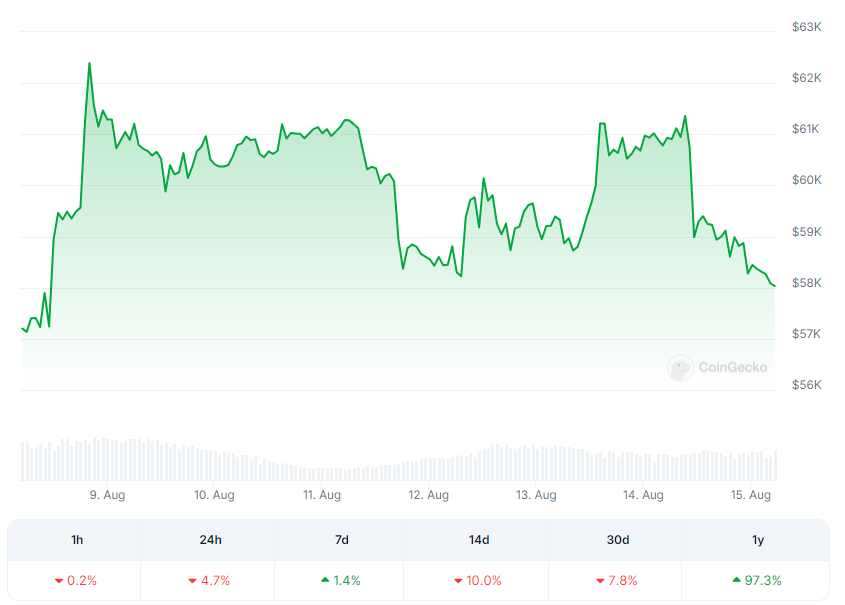 Bitcoin (BTC) abre este jueves 15 de agosto a la baja. Al momento de esta publicación, la caída de precio en dólares en las últimas 24 horas es cercana al 5%.