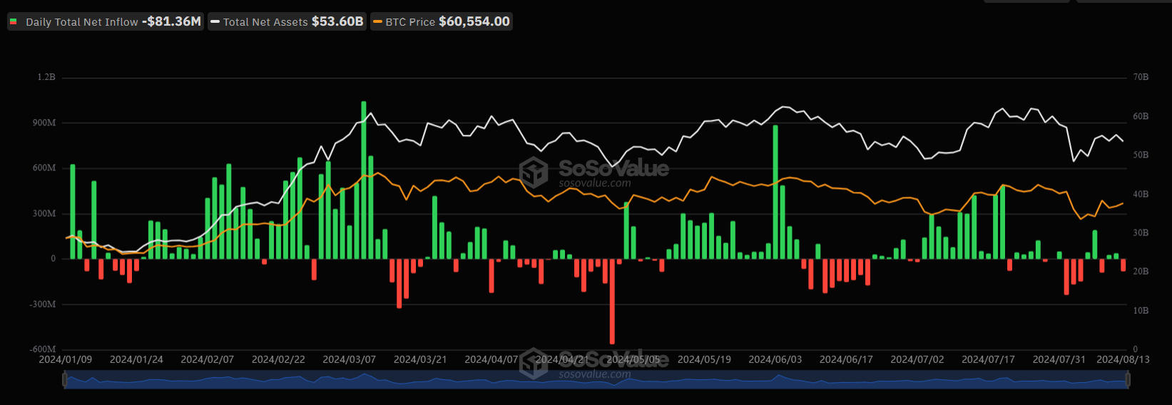 Ayer, 13 de agosto, estos productos financieros tuvieron, en conjunto, un día negativo. Las salidas de capital netas de los ETF de bitcoin fueron de 81 millones de dólares.