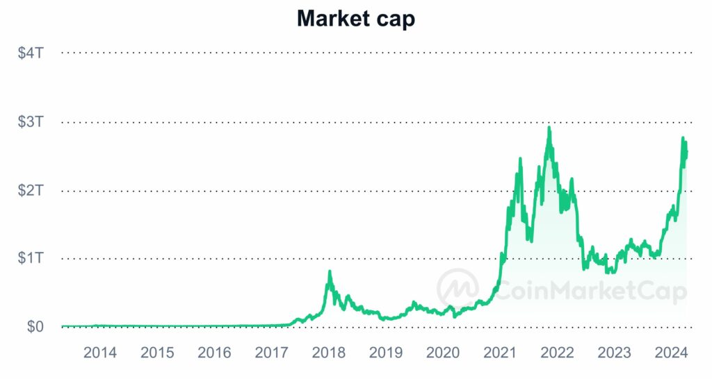 Por factores como la macroeconomía, el halving de bitcoin (BTC) y los fondos cotizados (ETF) de bitcoin lanzados en Estados Unidos, espera que se duplique el valor del mercado de criptomonedas para finales del 2024. Actualmente, la capitalización total de estos activos es de 2,5 billones de dólares (USD) como se ve a continuación.