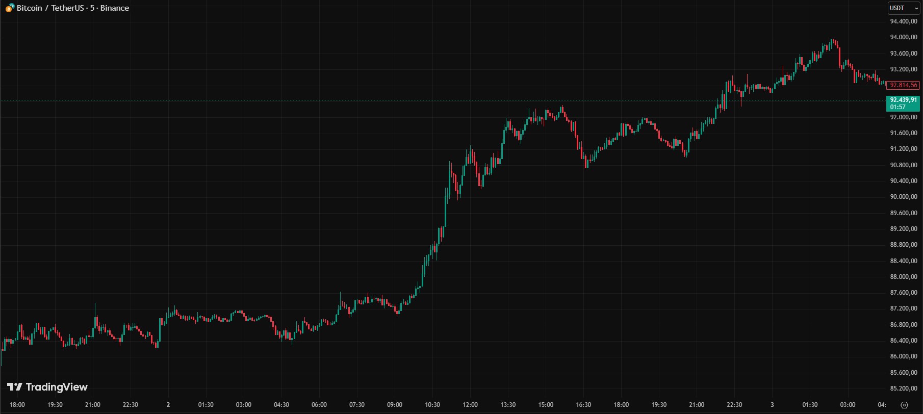 Muestra del impacto de este factor es que, tras conocerse la noticia, bitcoin se disparó hacia los 91.000 dólares el martes 2 de diciembre. Así se aprecia en la siguiente gráfica:
