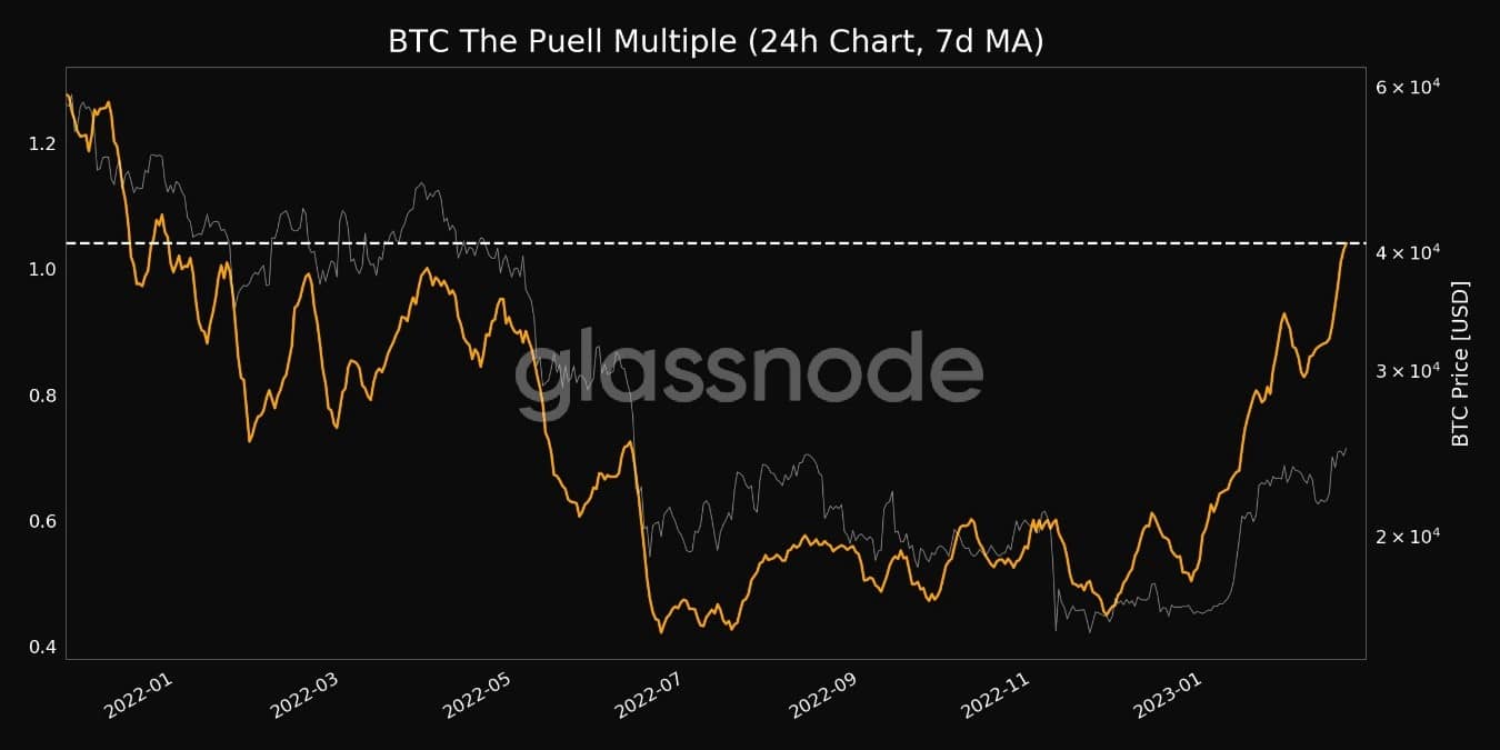 Dicho indicador acaba de llegar a su nivel más alto en 13 meses, según datos de la firma de análisis Glassnode. En su cuenta de alertas en Twitter, la empresa señala que el Múltiplo de Puell se sitúa en 1,041 por primera vez desde enero del año pasado.