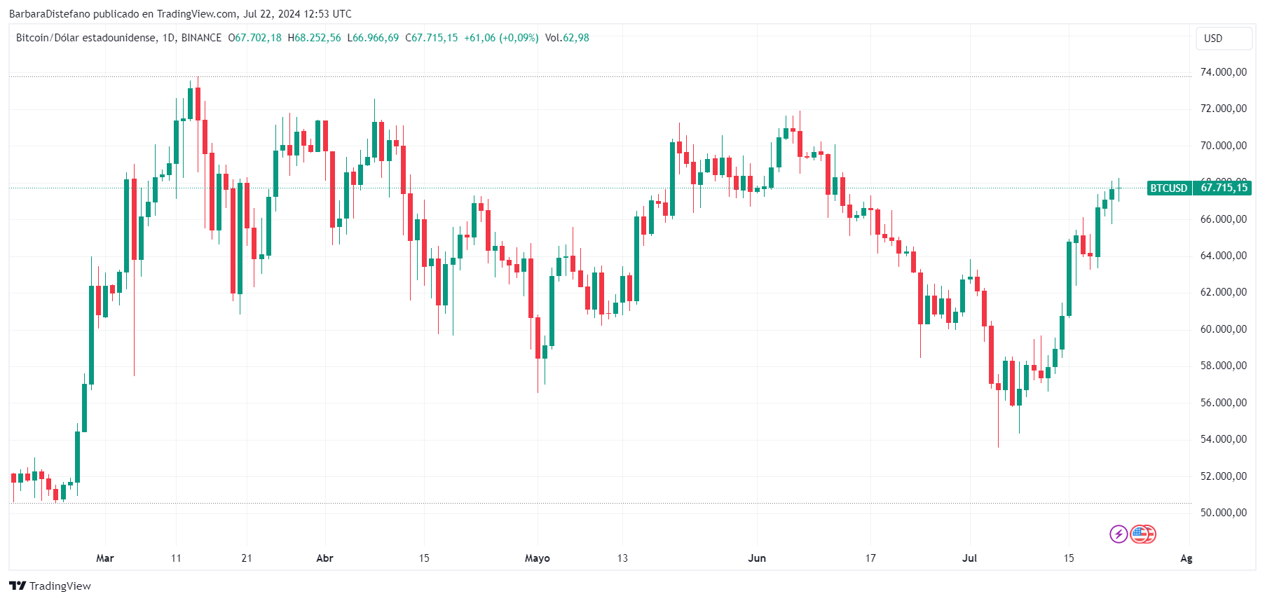 Bitcoin suele comportarse en correlación con las tendencias del S&P 500, por lo que este escenario presagia su continuidad alcista. La moneda digital se encuentra desde hace cuatro meses cotizando en un rango lateral debajo del nuevo máximo histórico que tocó en 73.700 dólares (USD), como se ve a continuación.