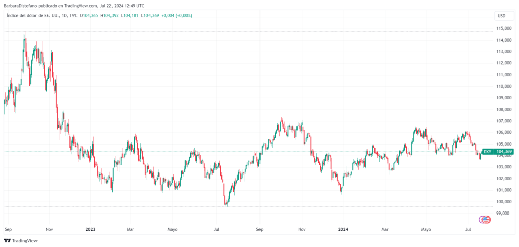 “Esto refleja que definitivamente hay margen para más de un recorte de tasas en 2024”, enfatiza la estratega de Invesco. Con este contexto, espera que el valor del dólar estadounidense, exhibido a continuación, se debilite más y los mercados bursátiles suban, como suele suceder durante ablandamientos de la política monetaria.