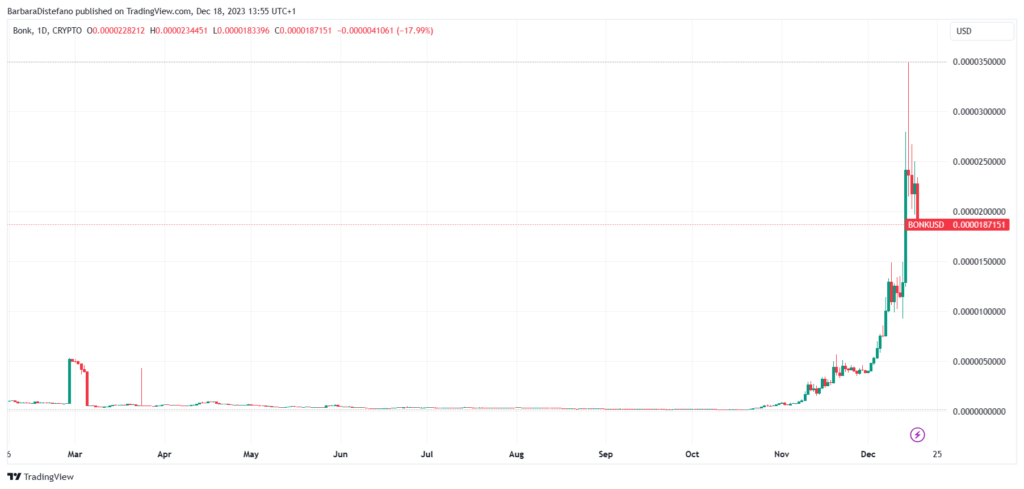 El alza de BONK, que ha sido de más del 17.000% en lo que va del 2023, tomó lugar principalmente en los últimos dos meses en medio de la subida de bitcoin (BTC) hasta los USD 44.000, su máximo en 18 meses. Como reportó CriptoNoticias, este impulso del mercado ha sido por las expectativas alcistas que hay en torno a la posible aprobación de sus fondos cotizados (ETF) en Estados Unidos, entre otras razones.