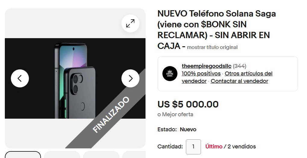 En la plataforma de comercio eBay se han concretado reventas de los teléfonos de Solana por hasta 5.000 dólares, como exhibe la siguiente captura de pantalla. Y actualmente incluso hay ofertas de ventas disponibles por más de 7.000 dólares. De este modo, ha alcanzado cotizaciones más altas que smartphones de reconocidas marcas como iPhone, que oscilan hasta los 1.300 dólares.