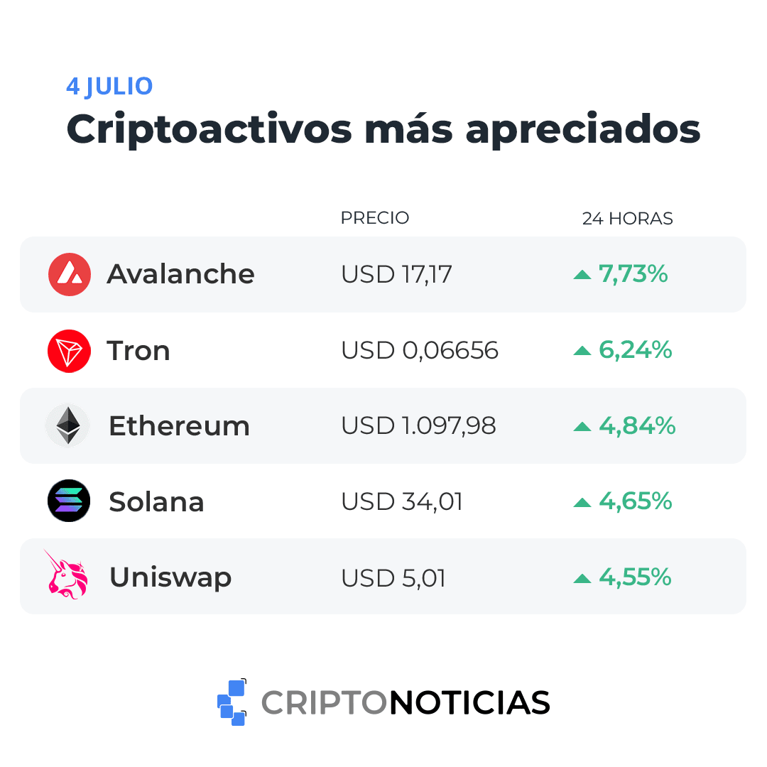 El top de esta semana lo completan Solana (SOL) con más de 4,5% de subida; y Uniswap (UNI), que aumentó más de 4% y alcanzó los 5 dólares como valor de mercado.