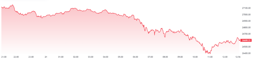 Bitcoin (BTC) tuvo una caída de precio cercana al 2% en las últimas 24 horas. Al momento de esta publicación, tal como puede verse en la Calculadora de Precios de CriptoNoticias, cada BTC se comercia por USD 26.560.