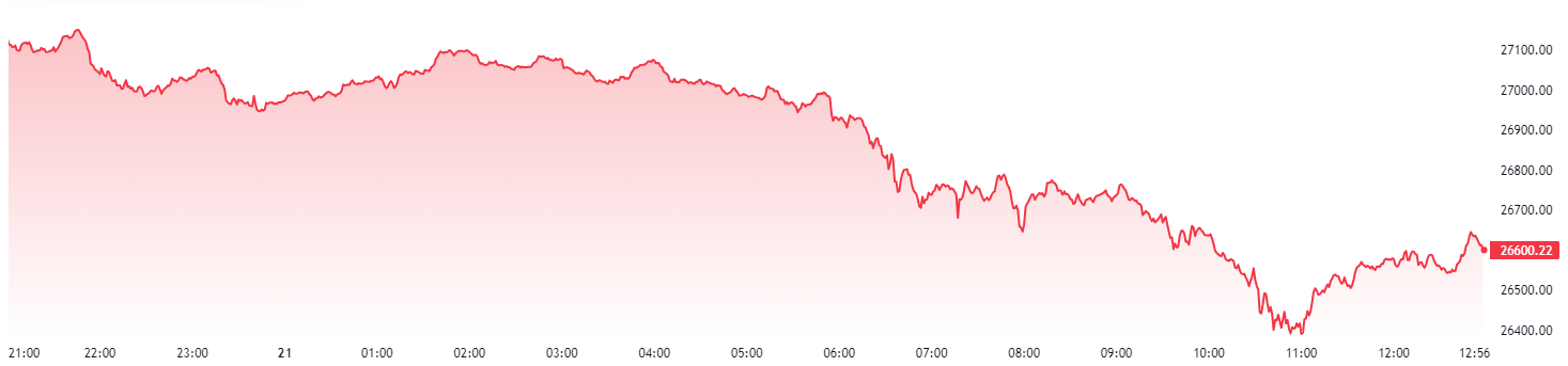Bitcoin (BTC) tuvo una caída de precio cercana al 2% en las últimas 24 horas. Al momento de esta publicación, tal como puede verse en la Calculadora de Precios de CriptoNoticias, cada BTC se comercia por USD 26.560.