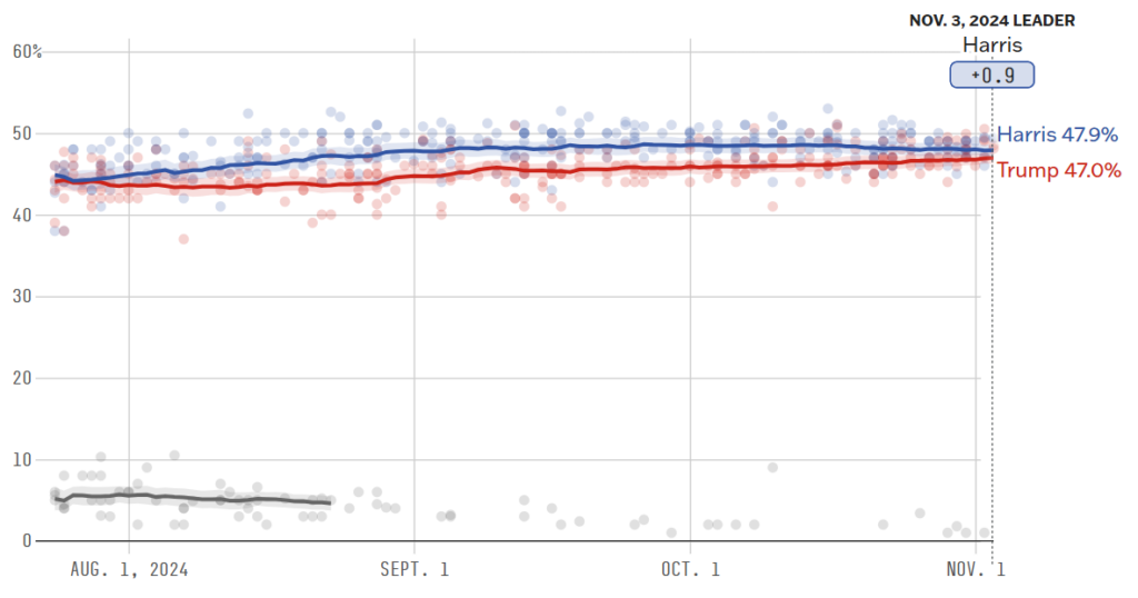 Según el sitio fivethirtyeight.com, las encuestas muestran una tendencia levemente favorable a Kamala Harris, como se aprecia en el siguiente gráfico.