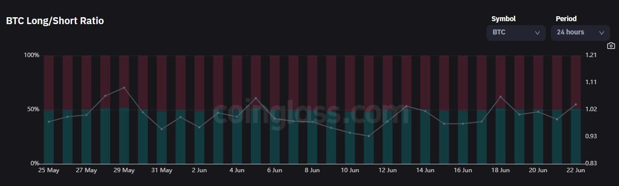 La proporción de posiciones en largo (alcistas) y corto (apuestas a la baja) es de apenas 51,23% a 48,77% en ese rango horario. Así lo reflejan los registros de Coinglass con datos de los principales 12 exchanges que ofrecen derivados de bitcoin.